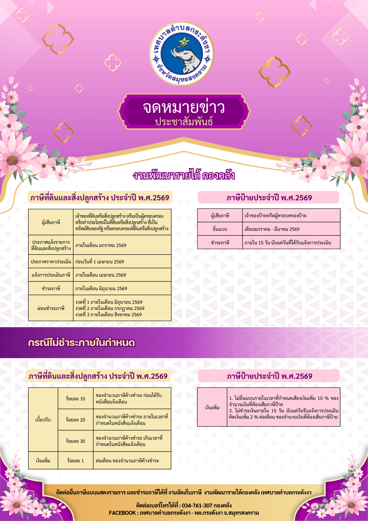 ด้วยงานจัดเก็บและพัฒนารายได้ กองคลังเทศบาลตำบลกระดังงา ได้ดำเนินการจัดทำจดหมายข่าวเพื่อประชาสัมพันธ์ เรื่องของการจัดเก็บภาษีประจำปี ๒๕๖๙ เพื่อให้ประชาชนภายในเขตพื้นที่เทศบาลฯ ได้ทราบโดยมีรายละเอียด ดังนี้